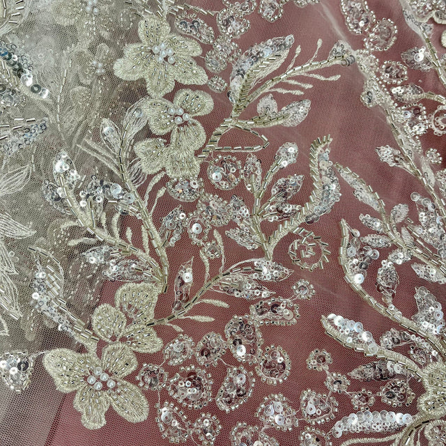 Enhance your special occasion wardrobe with this luxurious Beaded Lace Fabric embroidered on 100% polyester net mesh. Featuring intricate bead, sequin, and pearl details, this elegant lace is perfect for wedding gowns, evening dresses, quinceañera attire, and dance costumes. Measuring approximately 54" wide and sold by the yard, it provides ample material for couture creations that are both sophisticated and unforgettable.