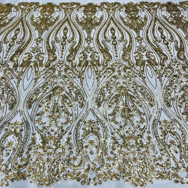 Add couture elegance to your formal designs with this gold beaded lace fabric embroidered on 100% polyester net mesh. Featuring intricate patterns embellished with pearls, sequins, and beads, this fabric delivers a luxurious, romantic look perfect for evening gowns, wedding dresses, quinceañera outfits, and dance costumes. Its durable mesh base ensures long-lasting quality, while the soft drape allows for graceful movement and timeless silhouettes. With a generous 54-inch width, this stunning lace is ideal for statement garments that command attention on any special occasion.