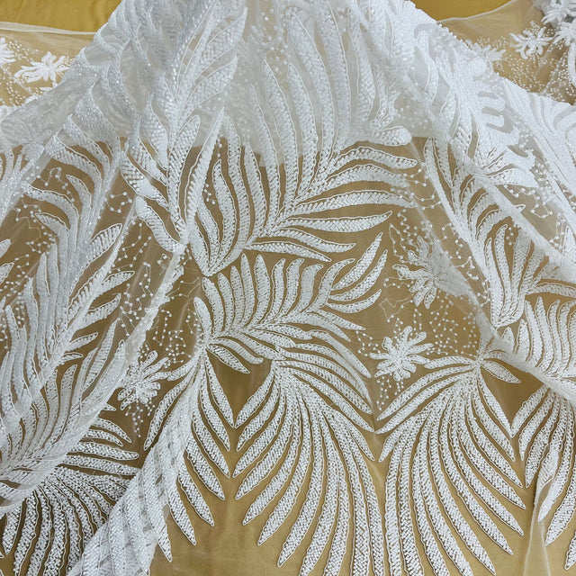 Enhance your special occasion wardrobe with this luxurious gold beaded and corded bridal lace fabric embroidered on 100 percent polyester net mesh. Ideal for wedding gowns, evening dresses, quinceañera outfits, and dance costumes, it features intricate beadwork, corded embroidery, and elegant embellishments for a couture-inspired finish. Lightweight yet durable, this fabric drapes beautifully, adding sophistication, sparkle, and timeless charm to any ensemble. Available in five dazzling colors, it allows you to create unforgettable garments that make a lasting impression at every formal event.
