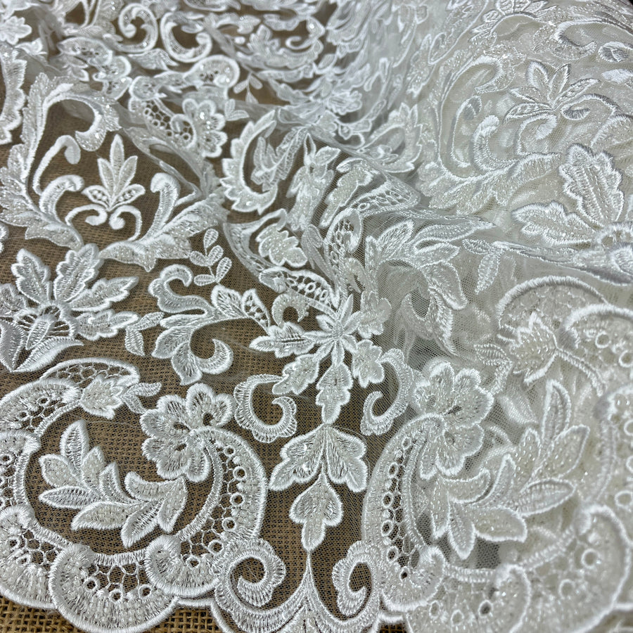 Elevate your special occasion designs with this Luxurious Beaded Lace Fabric embroidered on 100% polyester net mesh. Featuring intricate floral embroidery with sequins and beads, this elegant lace is perfect for wedding gowns, evening dresses, quinceañera attire, and dance costumes. Measuring approximately 51" wide and sold by the yard, it offers ample material to create couture-quality garments and decorative projects that make a lasting impression.
