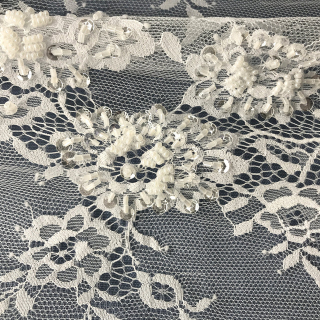 Add a luxurious touch to your special occasion garments with this beaded Chantilly embroidered lace fabric featuring a delicate eyelash scallop. Crafted from 100% polyester, this exquisite lace showcases intricate beading, pearls, sequins, and French Alencon embroidery, making it perfect for bridal gowns, evening dresses, quinceañera attire, and dance costumes. Its delicate floral design is both elegant and timeless, while the 58" width and 3-yard piece provide ample material for couture creations and decorative projects.