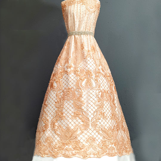 Elevate your special occasion designs with this elegant beaded lace fabric embroidered on 100% polyester net mesh. Featuring delicate beads, intricate embroidery, and pearl details, this luxurious lace is perfect for bridal gowns, evening dresses, quinceañera attire, and dance costumes. Its soft yet durable polyester mesh provides a graceful drape and couture-quality finish, making it ideal for designers and dressmakers creating high-end formal wear and statement pieces.