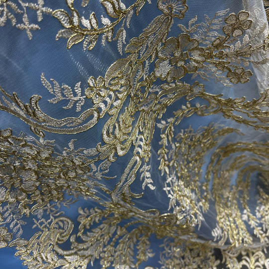 1 Yard Elegant Corded Bridal Lace Fabric Embroidered on Polyester Net Mesh - Gold is backordered and will ship as soon as it is back in stock.
