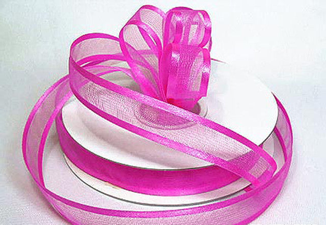 A vibrant fuchsia organza ribbon with satin edges, perfect for adding bold color and elegance to your gifts and decorations.