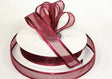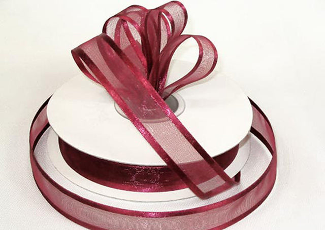 A rich burgundy organza ribbon with satin edges, perfect for adding a sophisticated and elegant touch to your décor and gift wrapping.