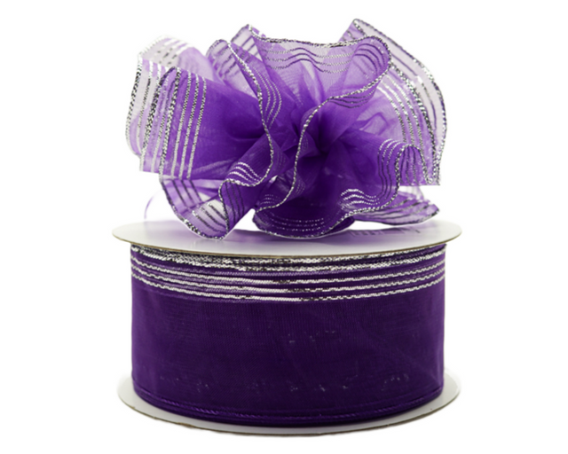 A striking purple and silver organza pull bow ribbon, perfect for adding a regal and elegant touch to your gift wrapping and event décor.