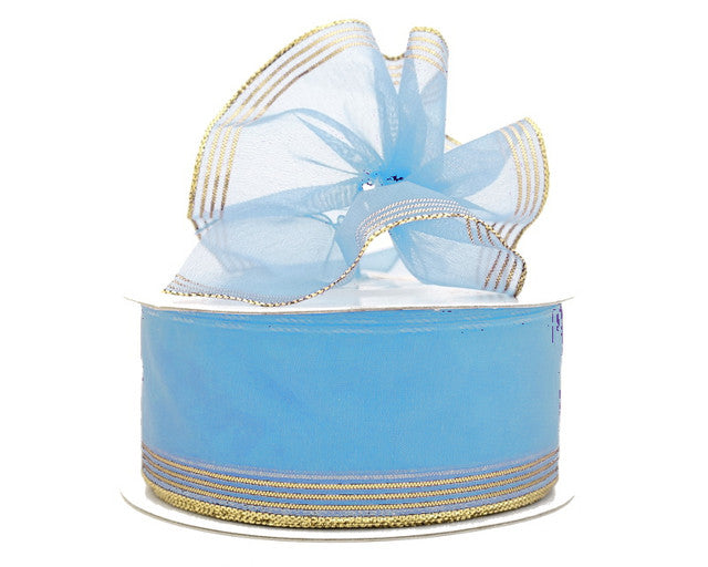 A soft light blue and gold organza pull bow ribbon, perfect for adding a gentle and sophisticated touch to your gifts and decorations.