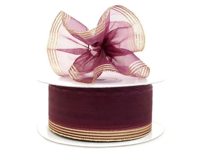 1.5"x25 yards Burgundy Gold Trim Organza Pull Bows Gift Ribbon