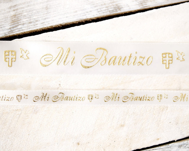 3/8" x 25 Yards Gold "Mi Bautizo" Printed Satin Ribbon for Baptism Favors