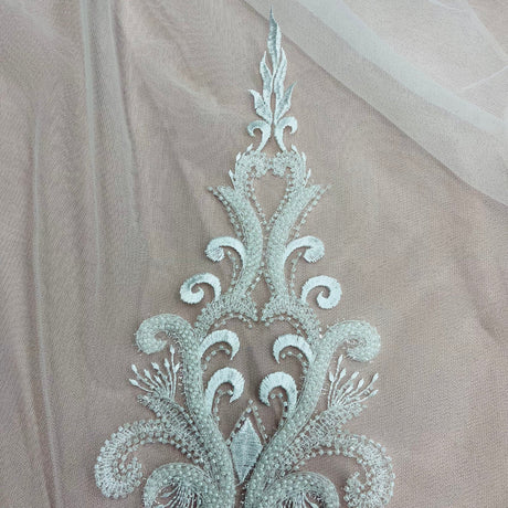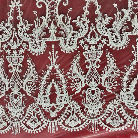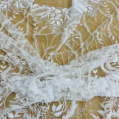 1 Yard Beaded and Corded Bridal Lace Fabric Embroidered on Polyester Net Mesh