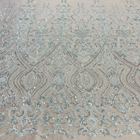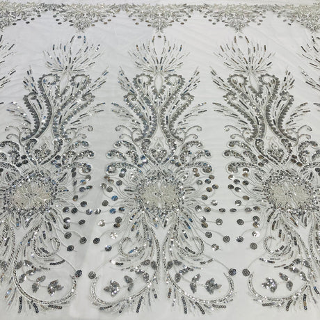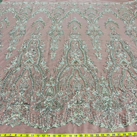 1 Yard Beaded & Sequined Lace Fabric, Ivory, Silver, and Blush