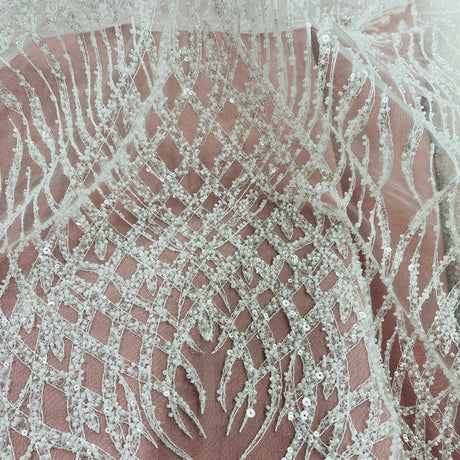 1 Yard Beaded Lace Fabric Embroidered on 100% Polyester Net Mesh Off White