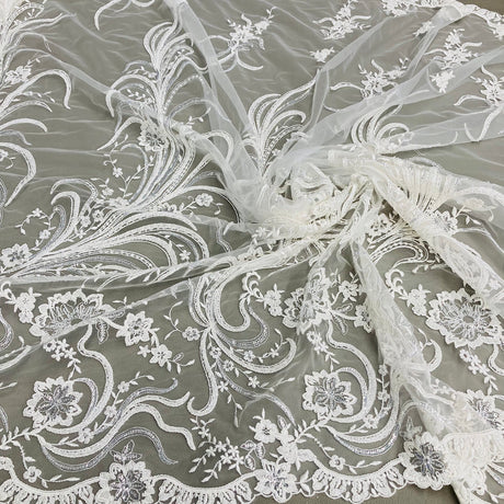 1 Yard Ivory Beaded and Corded Bridal Lace Fabric Embroidered on Polyester Net Mesh 48 Inch Width