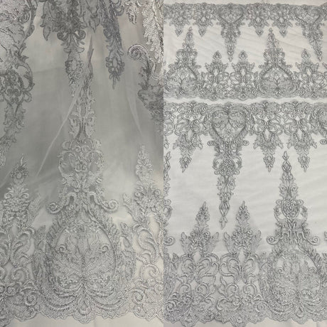 1 Yard Ivory with Silver Beaded and Corded Bridal Lace Fabric on Polyester Net Mesh 51 Inch Width