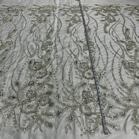 1 Yard Silver Beaded Lace Fabric Embroidered on Polyester Net Mesh Pearls Sequins 54 Inch Width