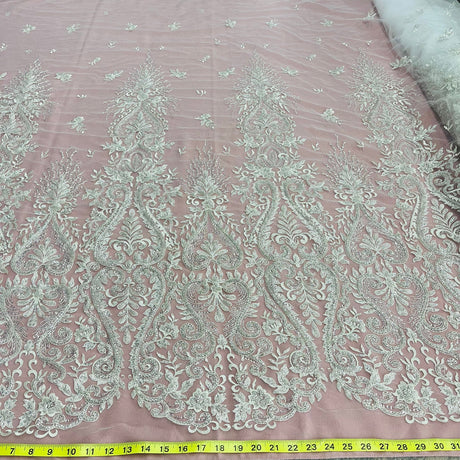 1 Yard Beaded Corded Bridal Lace Fabric Embroidered on Polyester Net Mesh Width 54 Inches