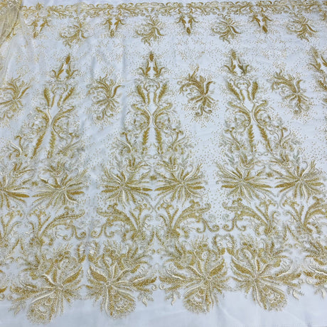 1 Yard Gold Beaded Lace Fabric Embroidered on 100 Percent Polyester Net Mesh 51 Inch Width
