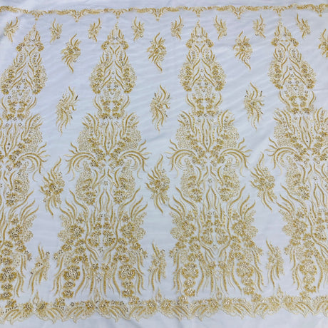 1 Yard Gold Beaded Lace Fabric Embroidered on 100 Percent Polyester Net Mesh 52 Inch Width