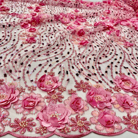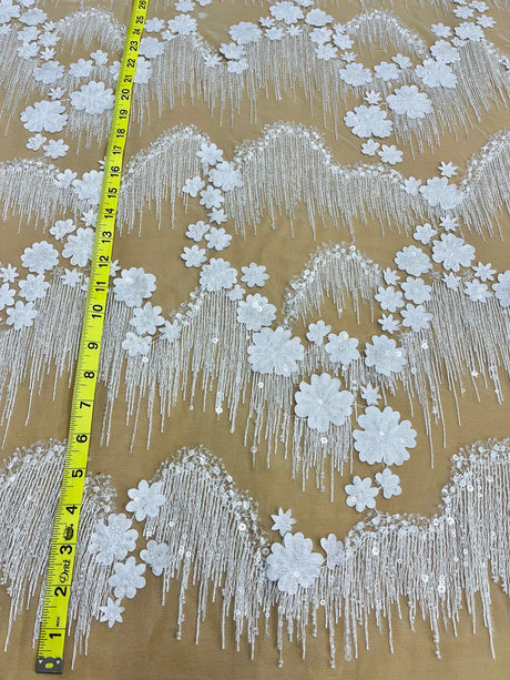 1 Yard Sparkling Beaded 3D Floral Lace Fabric White