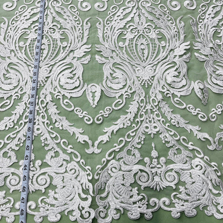 1 Yard Elegant Beaded & Corded Bridal Lace Fabric on 100% Polyester Net Mesh - White
