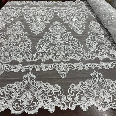 1 Yard Beaded and Corded Bridal Lace Fabric Embroidered on 100% Polyester Net Mesh White