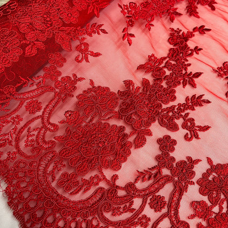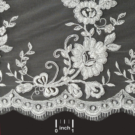1 Yard Corded Bridal Lace Fabric Embroidered on Net Mesh White
