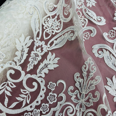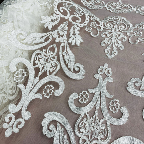 1 Yard Elegant Corded Embroidered Bridal Lace Fabric for Couture Gowns White