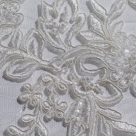 1 Yard Beaded Corded Bridal Lace Fabric Embroidered on Polyester Net White