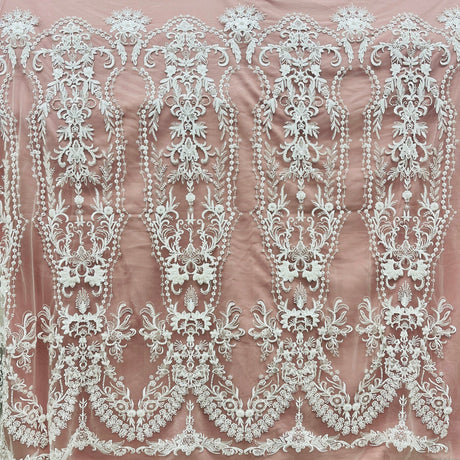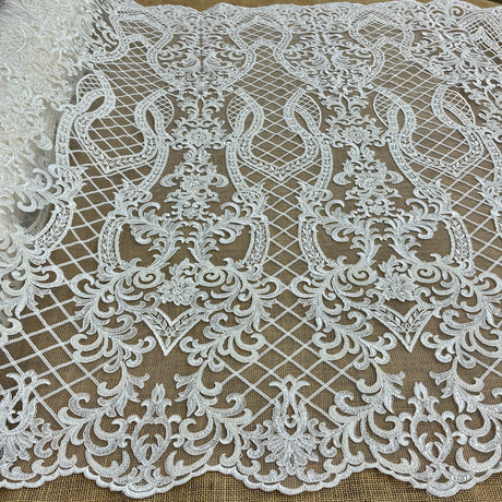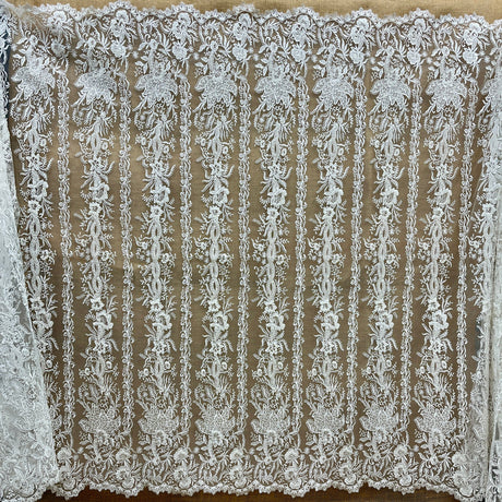 1 Yard Beaded & Corded Bridal Lace Fabric Embroidered on Polyester Net Mesh 52" Wide