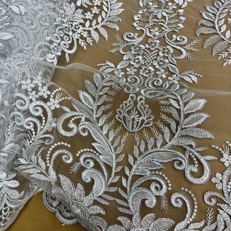 1 Yard Beaded and Corded Bridal Fabric Lace Embroidered on Polyester Net Mesh 54 inch Width