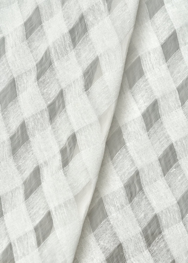 This white linen and rayon blend fabric features a 1-inch checker mesh weave that adds a subtle texture and modern appeal. Weighing 2.5 oz per square yard, it offers a lightweight, breathable material ideal for delicate apparel, scarves, and layered textiles. The 60-inch width provides ample fabric for versatile cutting and design options. Its flat mesh weave creates a unique tactile experience while maintaining softness and drape.