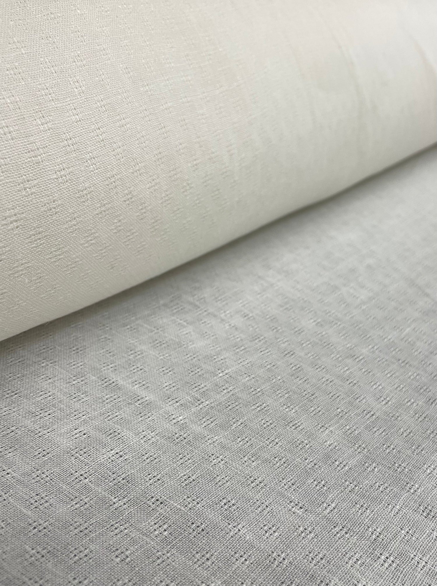 Discover the subtle sophistication of our Pure Linen Diamond Jacquard Fabric in an elegant Ivory hue. This exquisite material boasts an intricate interwoven squares jacquard weave, creating a beautiful diamond-like pattern that adds refined texture to any project. At a delicate 4 oz/yd² lightweight and a generous 60-inch width, this flat-weave linen offers a crisp finish and graceful drape. It's an impeccable choice for crafting luxurious apparel, delicate overlays, or unique home accents, bringing a touch of understated elegance and quality to your creative endeavors.