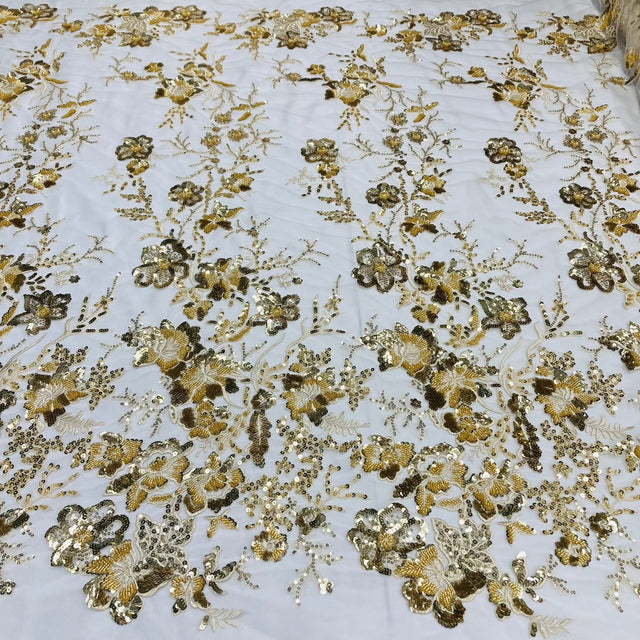 Elevate your designs with this elegant beaded and sequined lace fabric, intricately embroidered on 100% polyester net mesh. Featuring a stunning ivory base with luxurious gold accents, this 48 inch wide fabric is perfect for bridal wear, evening gowns, decor, and more. Lightweight, flexible, and visually striking, it brings sophistication and shimmer to any project.