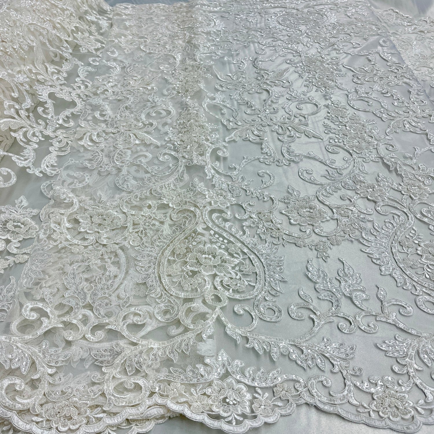 1 Yard Beaded & Corded Embroidered Bridal Lace Fabric on Mesh, Polyester, 54" Wide,