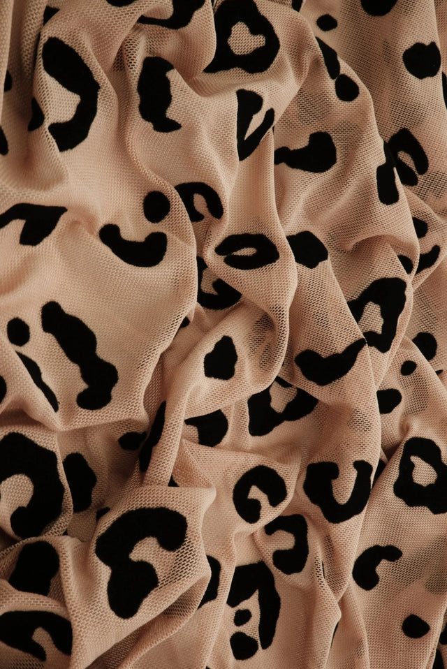 This medium-weight mesh fabric features a bold leopard flocking print on a breathable, stretchy surface. Made from 90% polyester and 10% spandex, it offers 4-way stretch and a soft drape—perfect for statement activewear, dancewear, fashion overlays, and edgy costumes.