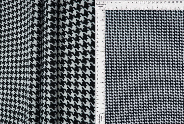 This black houndstooth 4x2 yummy rib knit fabric offers a perfect blend of comfort, texture, and timeless style. Made from 96% polyester and 4% spandex, it features a classic houndstooth pattern on a stretchy ribbed surface. Ideal for creating fitted tops, dresses, skirts, and casualwear, this fabric provides a soft feel with excellent stretch and recovery. Sold by the yard and easy to sew for any skill level.