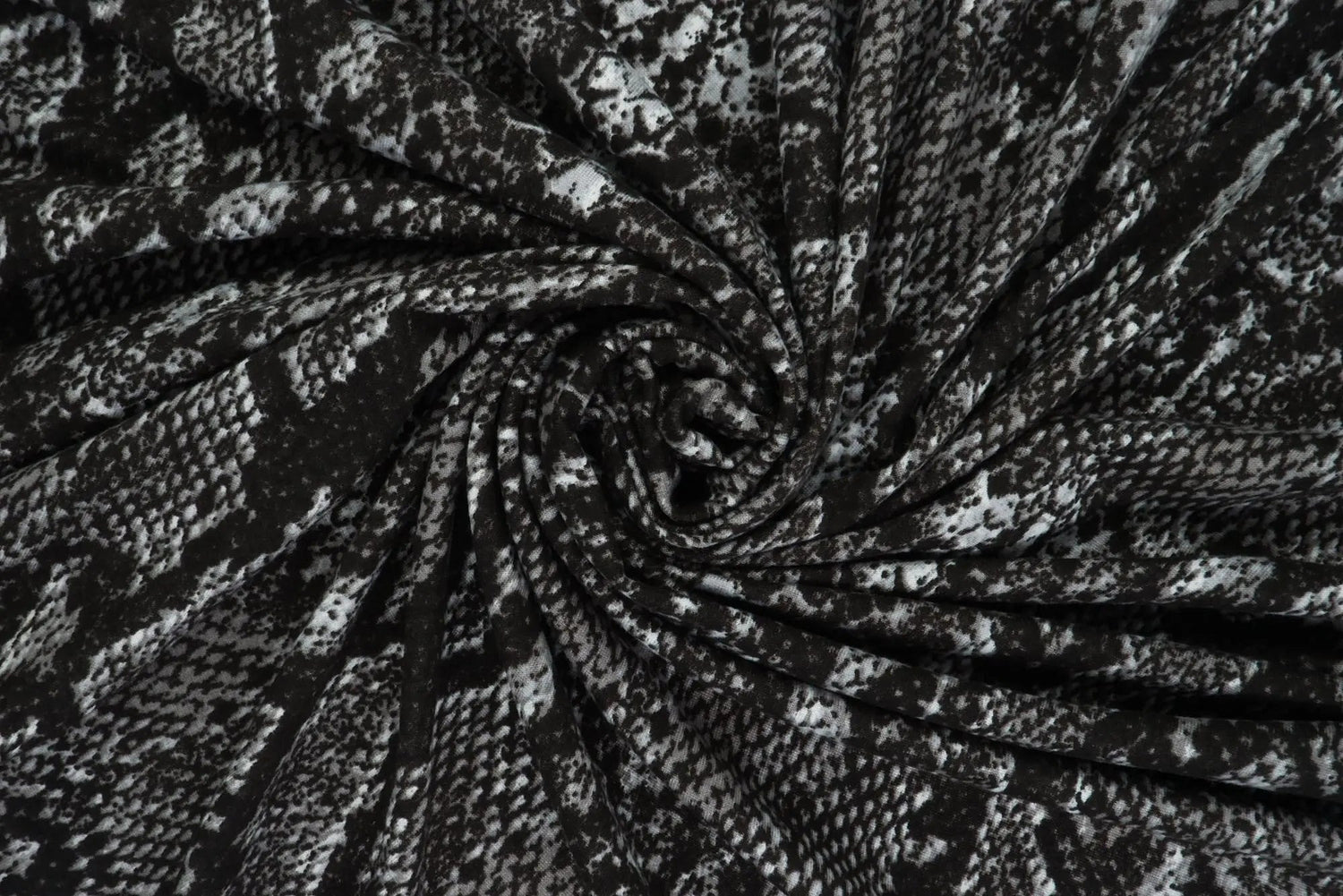 This DTY brushed fabric features a striking snake skin animal print with a soft and stretchy texture. Made from a durable polyester and spandex blend, it offers medium weight (170 GSM) and a fabric width of 58/60 inches. Perfect for stylish apparel like dresses, activewear, and tops.