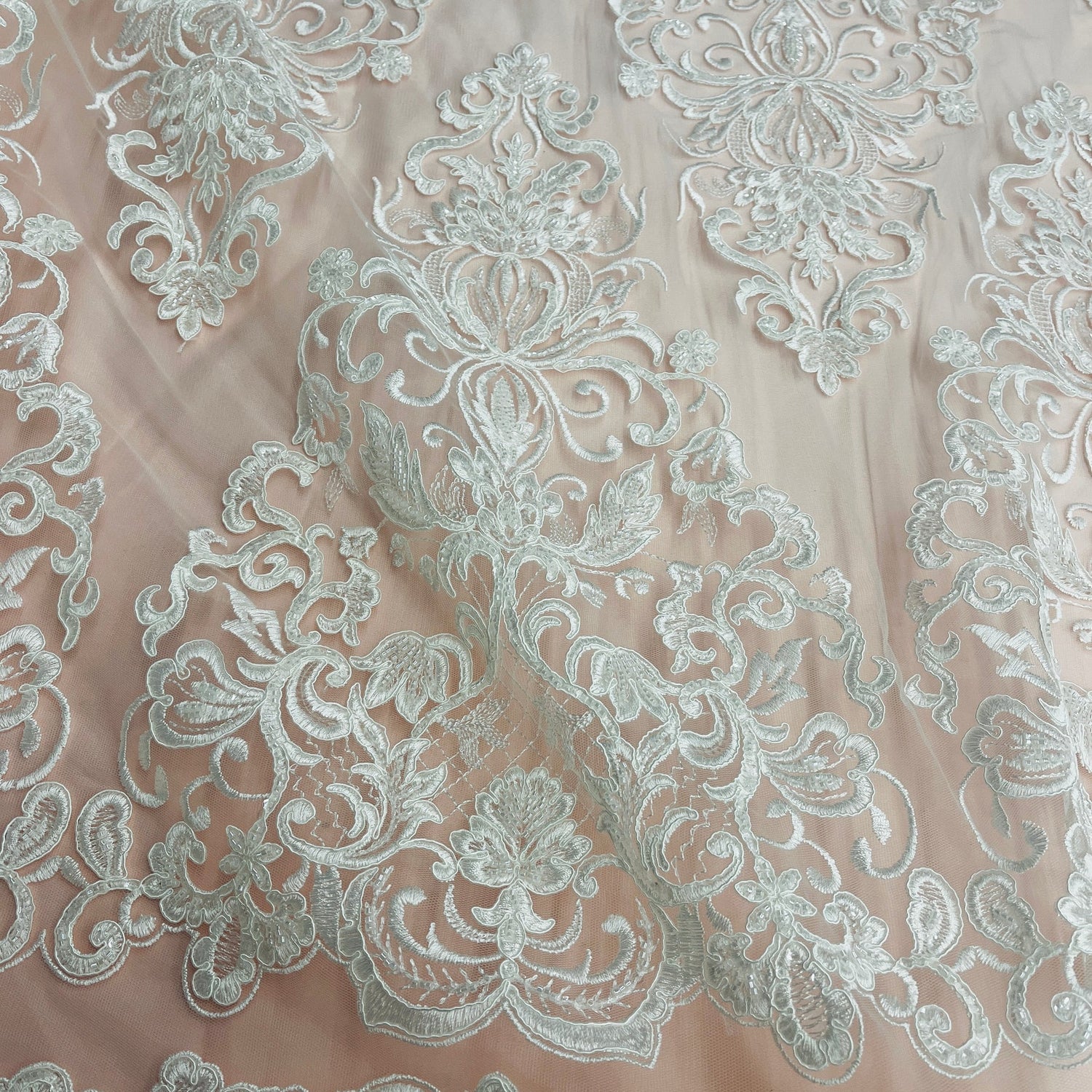 Elevate your designs with this elegant ivory beaded and corded lace fabric, embroidered on a soft 100% polyester net mesh. Measuring 51 inches wide, this fabric features intricate detailing perfect for bridal wear, evening gowns, veils, and luxury decor. Its high quality construction ensures durability and a sophisticated finish for your projects.