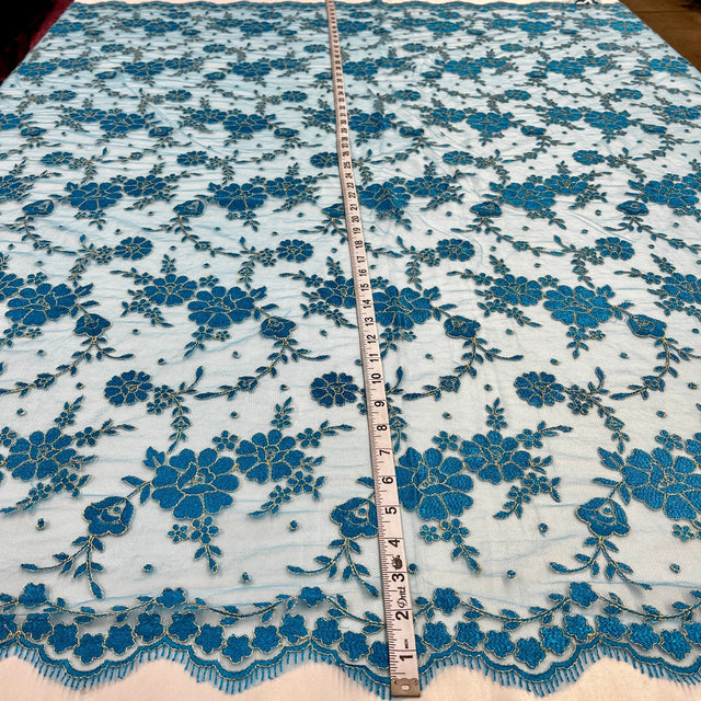 - High-quality polyester net mesh base embroidered with shimmering silver on turquoise for a luxurious finish
