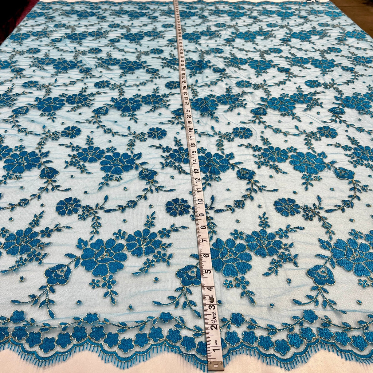 1 Yard Turquoise with Silver Lace Fabric Embroidered on Polyester Net Mesh 52 Inch Width