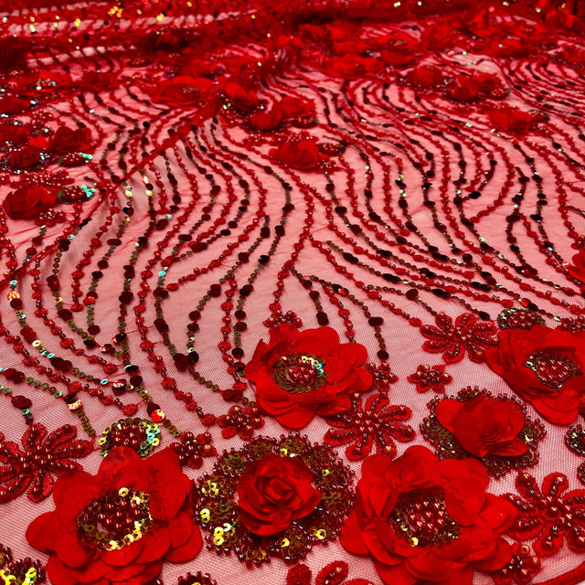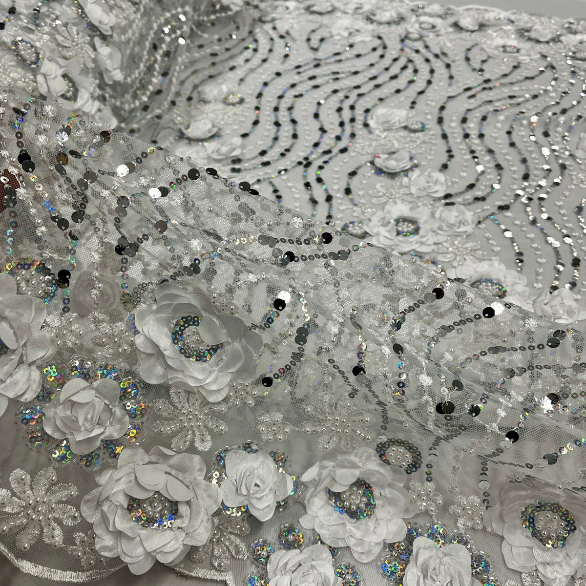 Elevate your designs with this luxurious 3D floral lace fabric, meticulously embroidered with shimmering sequins and hand-applied beads on a durable polyester mesh. Perfect for bridal gowns, eveningwear, and high-fashion projects, this fabric delivers both texture and sparkle for a standout finish.