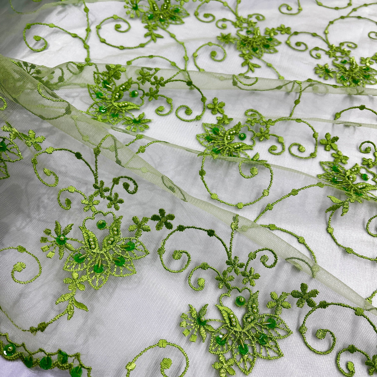 Add luxury to your creations with this intricately embroidered beaded lace fabric on a 100% polyester net mesh. Featuring delicate floral patterns with shimmering bead accents, this fabric is ideal for bridal gowns, evening dresses, veils, and upscale décor. Durable, lightweight, and easy to drape, it offers both elegance and versatility for high-end fashion or event styling.