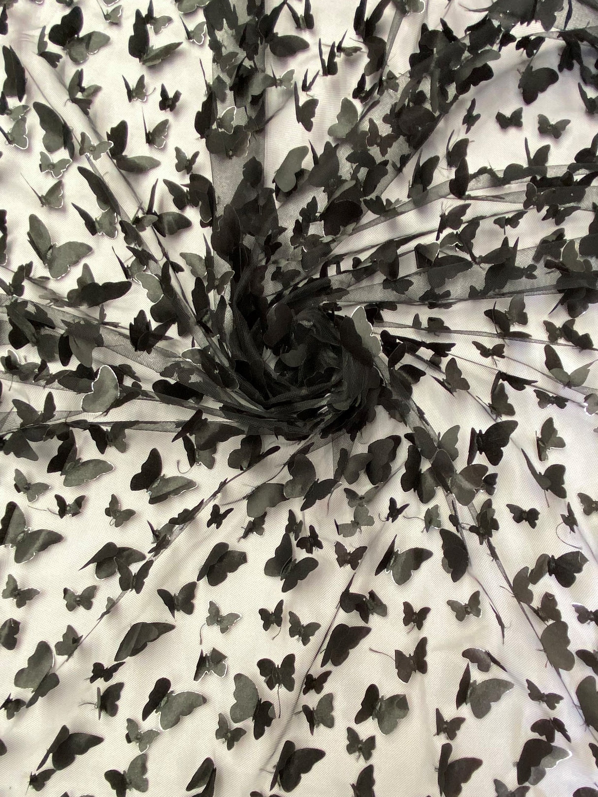 1 Yard Black 3D Butterfly Mesh Fabric with Satin Appliqué on Stretch Sheer Base 54 Inch Wide