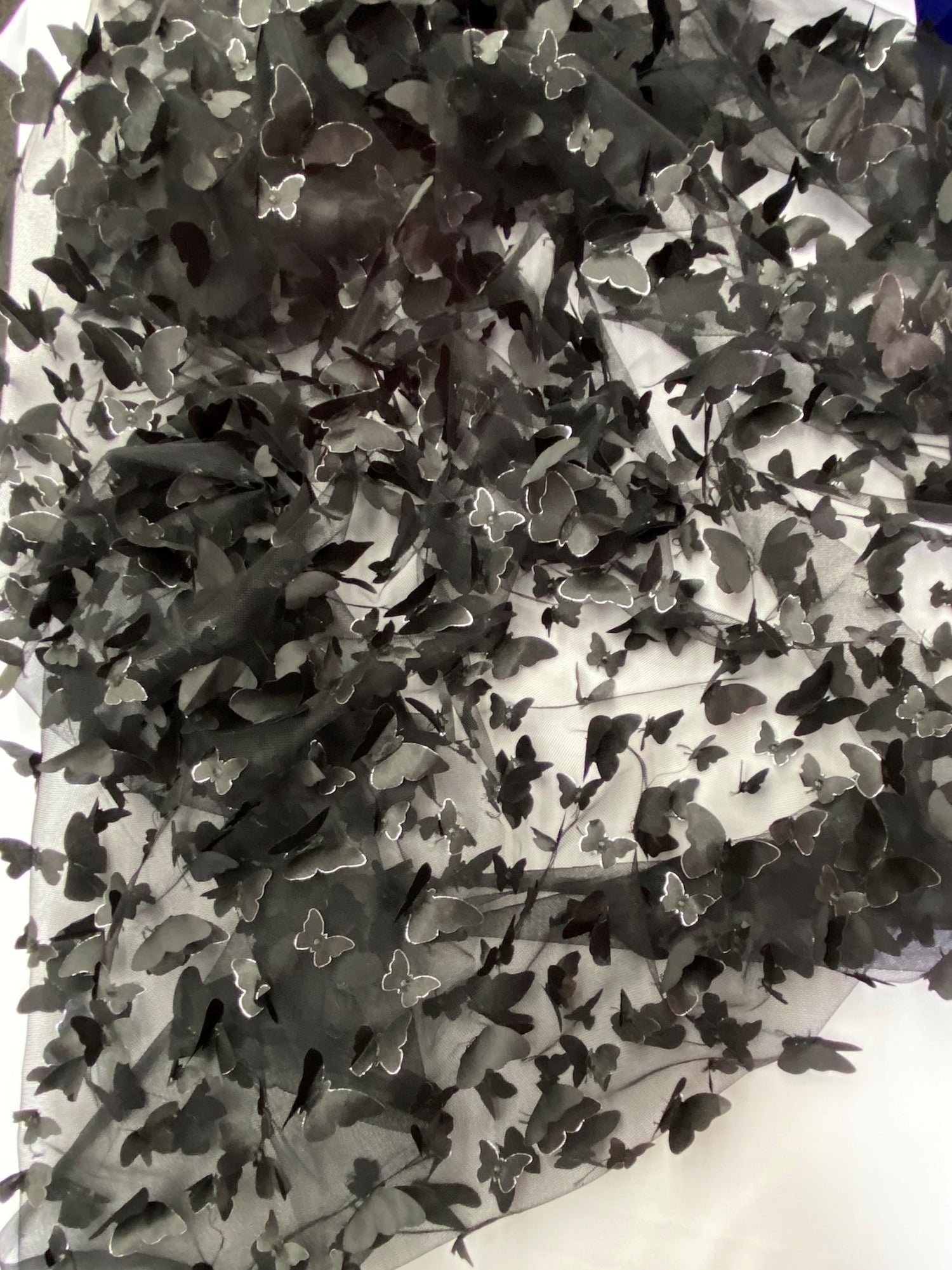 Add elegant texture and drama to your creations with this Black 3D Butterflies Mesh Fabric featuring delicate satin butterflies on soft stretch mesh. The sheer base offers gentle transparency, while the 2 way stretch ensures a flexible fit. Perfect for statement overlays, dance costumes, or formalwear accents. The versatile black tone complements a range of color palettes and styles.