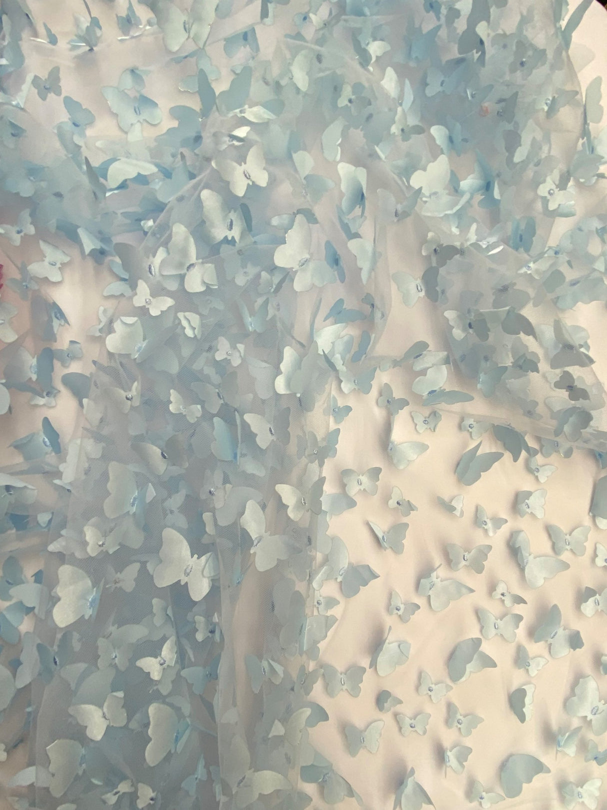 1 Yard Light Blue 3D Butterfly Mesh Soft Stretch Fabric with Satin Appliqué for Dresses, Costumes & Special Creations 54 Inch Wide