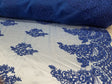 • Elegant French corded floral embroidery on soft royal blue mesh offers a sophisticated appearance for bridal and event use.