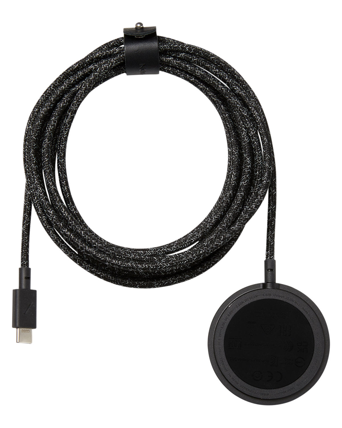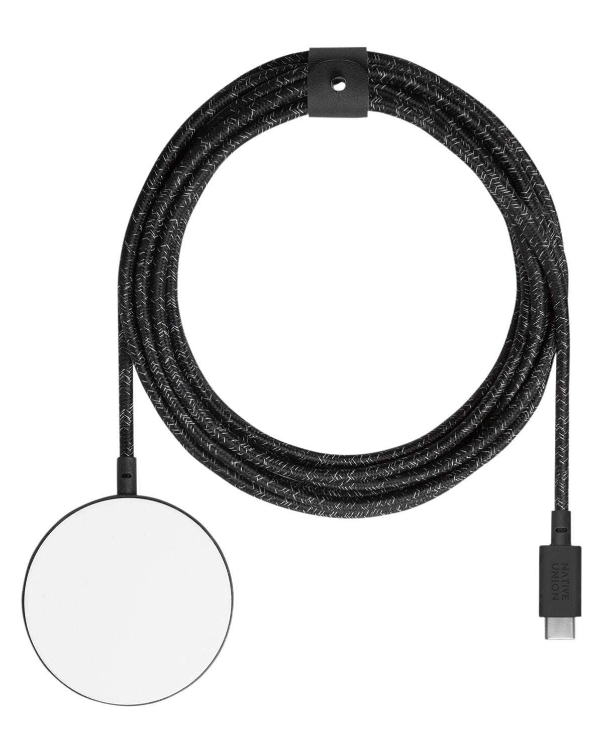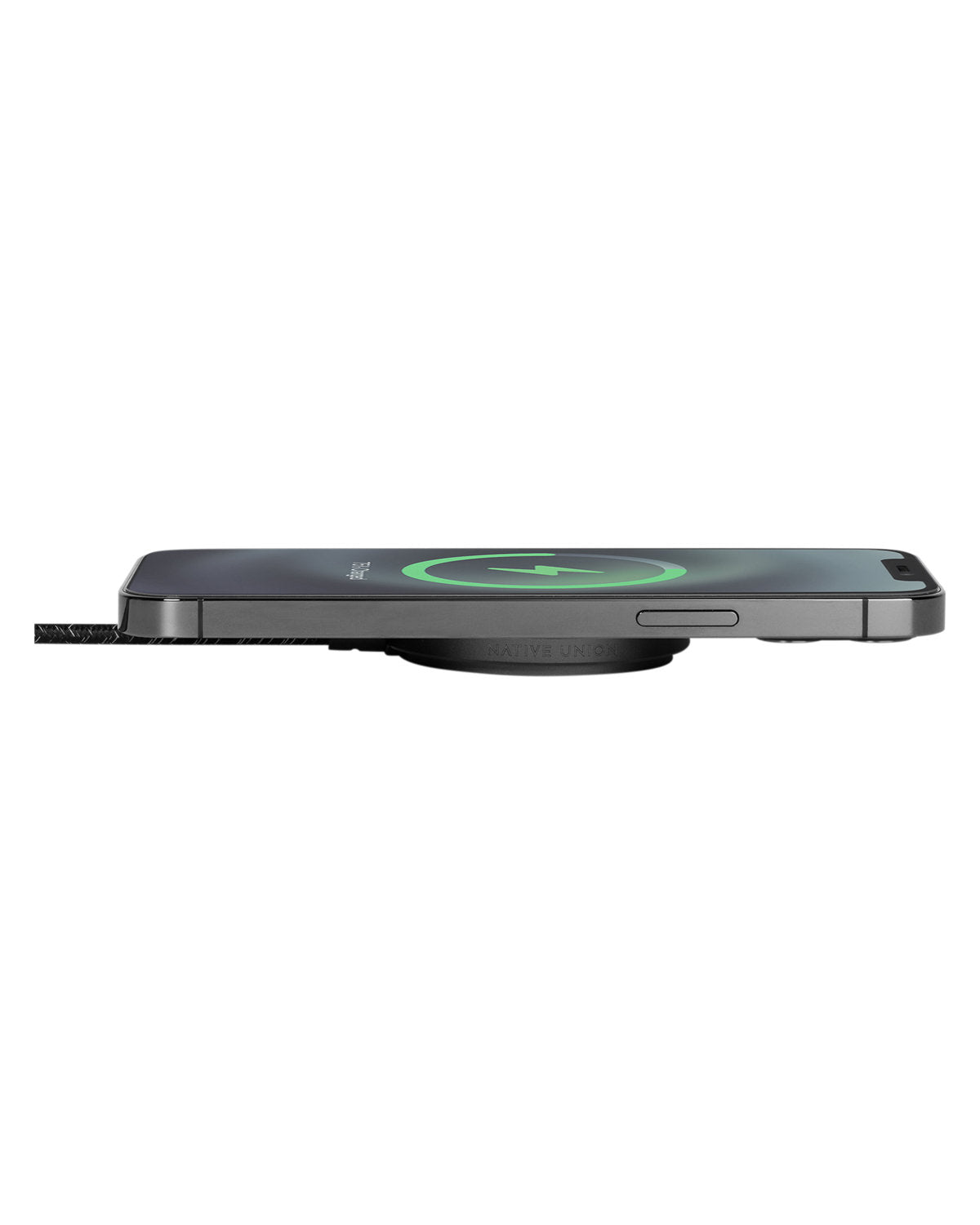 Upgrade your everyday charging needs with this nylon braided USB-C to magnetic wireless charging pad. Designed to support the latest MagSafe technology, it magnetically aligns with your iPhone 12 and later for fast and hassle-free wireless charging. The charging pad offers up to 7.5W for iPhone 12 and later, and up to 15W for other Qi-enabled devices. The extra-long 10ft cable comes with a leather belt for cable management, while the aluminum housing and non-slip silicone base provide durability and stability. The slim and sleek design is packaged in a retail gift box, making it a perfect charging solution for your tech essentials.