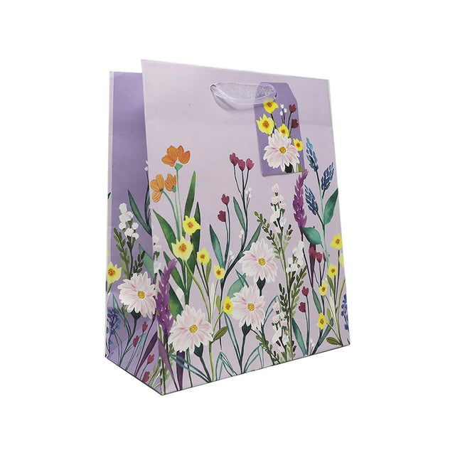 The Patterned Gift Bags (10" x 4" x 8") offer a vibrant and eco-friendly packaging solution for any occasion. These medium-sized bags feature a fully patterned exterior and interior, with spacious side gussets for easy filling. Each bag includes a white bottom insert for extra support, a coordinating gift tag, and sturdy handles. Made from 100% recycled paper with a minimum of 30% post-consumer fiber, these bags are printed with water-based inks and finished with non-toxic UV varnish. Sold in a case of 60, these bags are perfect for retail displays, gifts, and party favors.