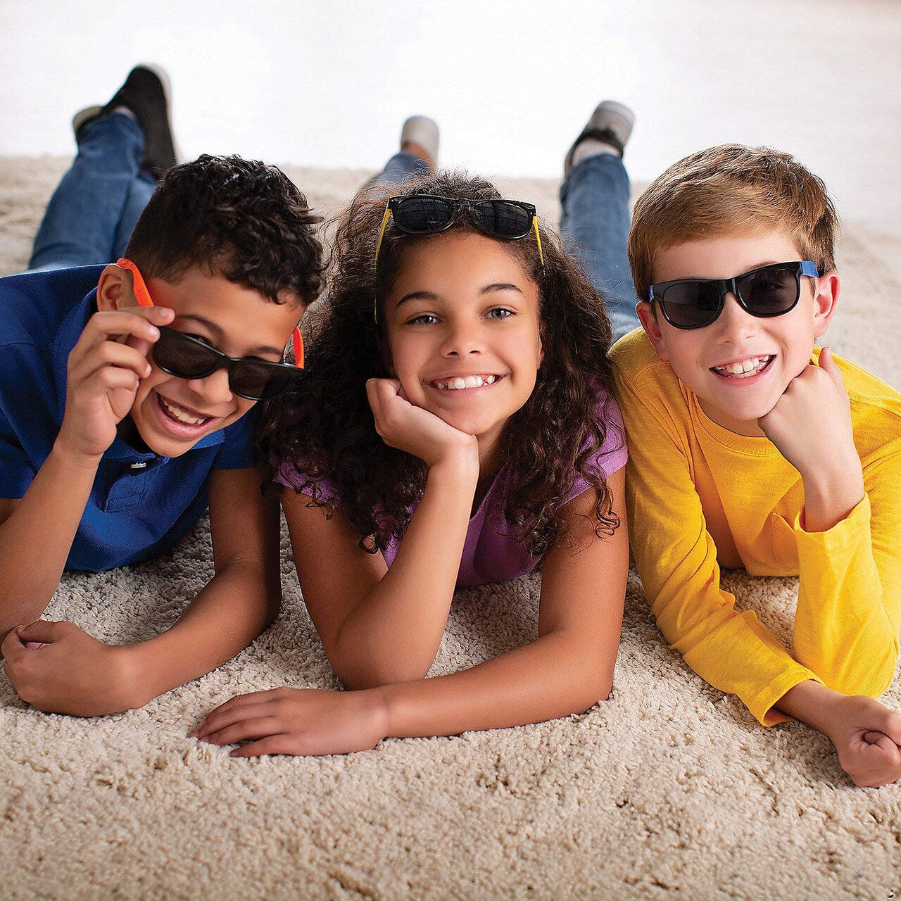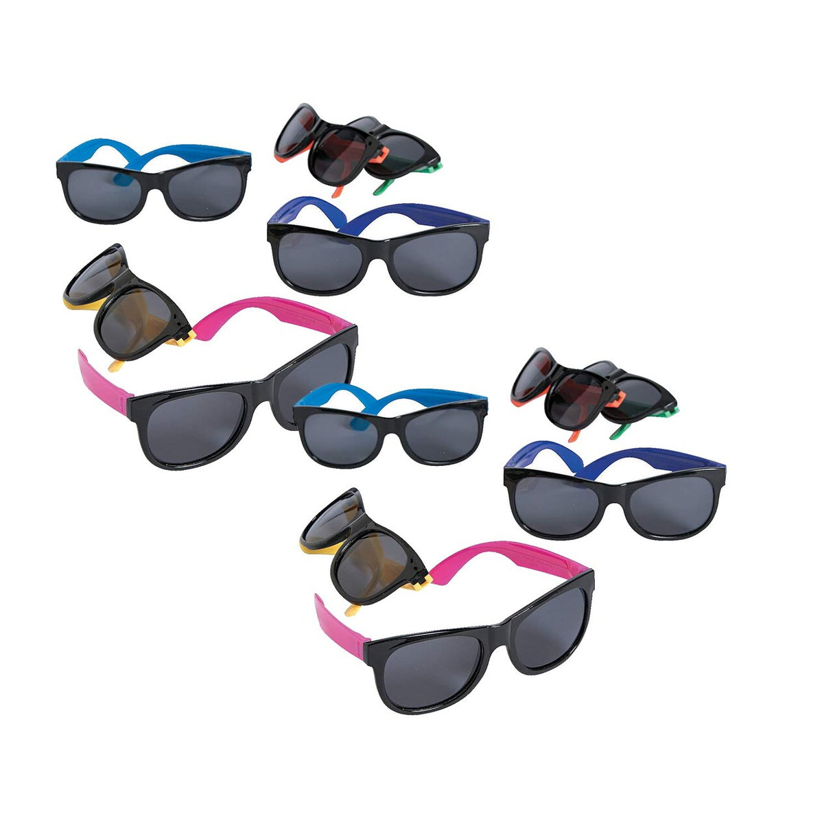 Kids will love these trendy nomad-style sunglasses featuring a cool mix of neon and black frames. Measuring 5" across, they’re a perfect fit for little faces and a great choice for party favors, school events, or outdoor fun. Set includes 12 sunglasses.
