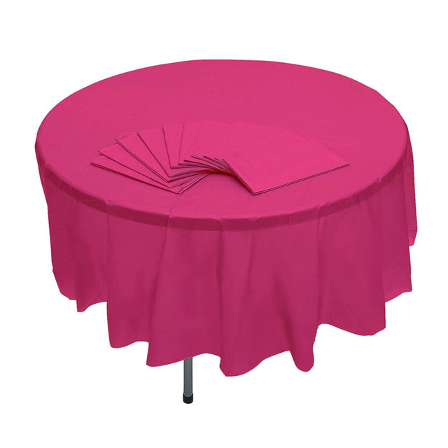 Add a burst of fun and elegance to any celebration with our Hot Pink Banquet-Style Round Disposable Plastic Tablecloths. Perfect for weddings, birthdays, baby showers, and more, these tablecloths are designed to fit 82-inch round tables and come in a bulk pack of 12, making them the ideal choice for large gatherings and events.